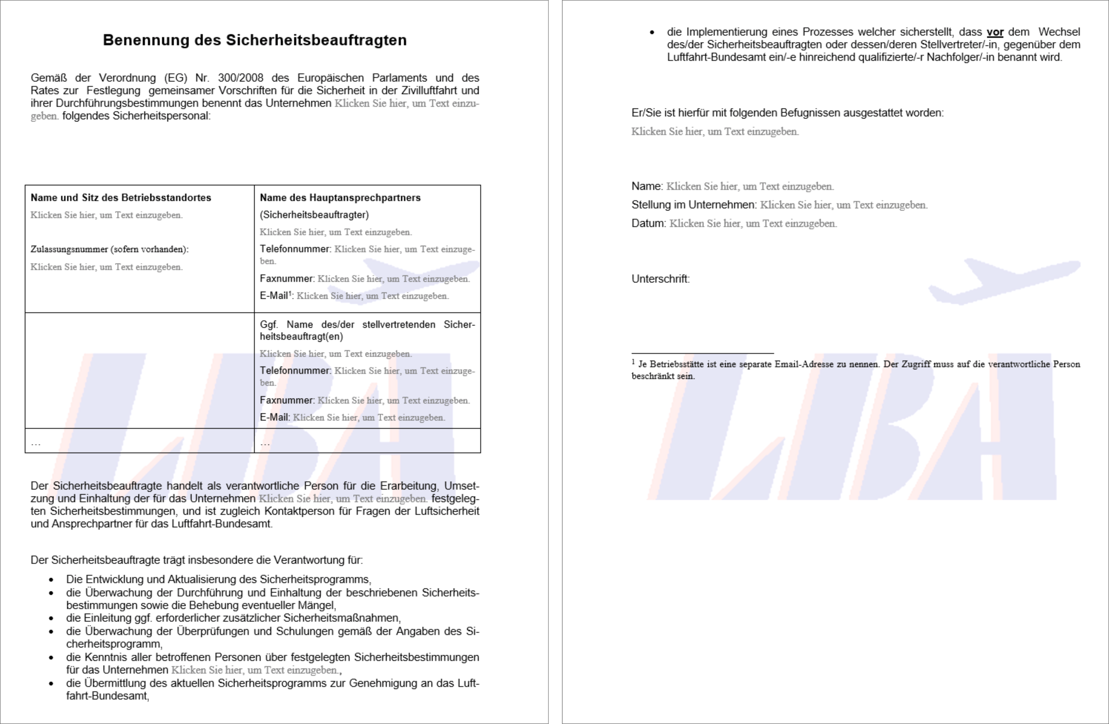 Für die Benennung des Sicherheitsbeauftragten und seines Stellvertreters, stellt das LBA ein Worddokument zur Verfügung.